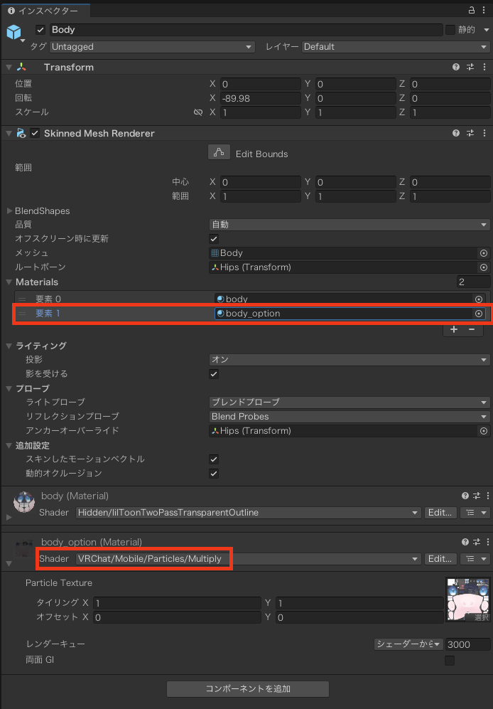 Bodyのインスペクタを開き要素1である”boty_option”のシェーダーを”VRChat/Mobile/Particles/Multiply”へ変更する