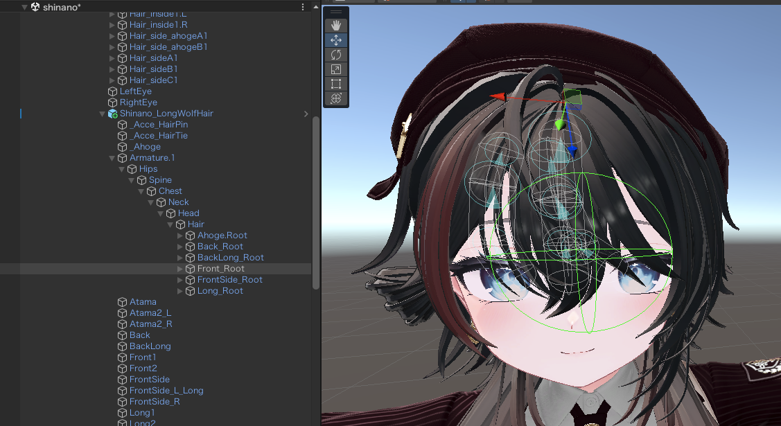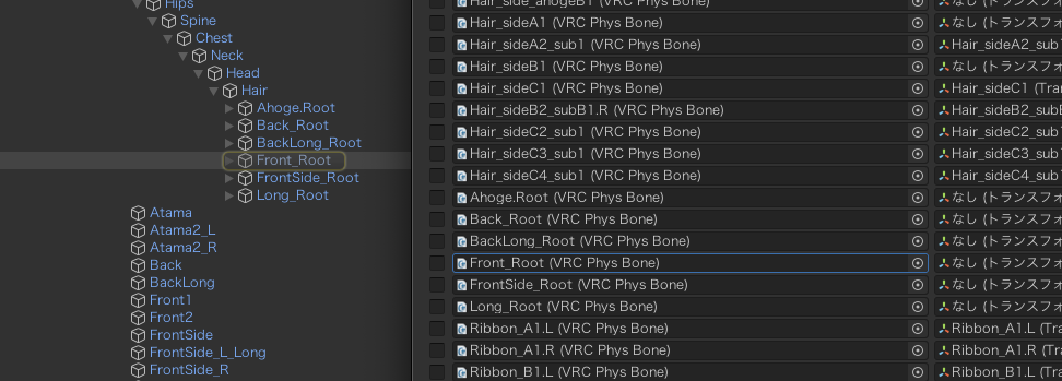 - PhysBonesを押下するとヒエラルキー側でハイライトされる